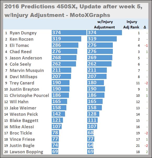 So, for instance Eli Tomac, having been "recently injured", we're showing here that we should take into account that his current riding performance is not expected to be as high as if he hadn't been injured (i.e. his history/age/experience projection). This adjustment drops Tomac down below Chad Reed by a fraction of a point. Again, this is only meant to be an indicator that Tomac is dealing with an injury, not a precise prediction that the injury will drop him below Reed.