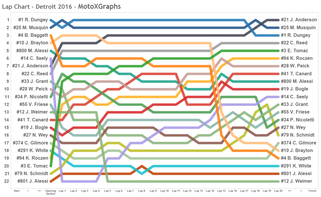 Ken Roczen got caught in the same situation, though Roczen did have a bit of a bobble about a quarter of a way down the opening straight, which sapped a bit of his speed. But once he was boxed in by that group and Bogle (from what I could tell), there wasn't much he could do except wait for the first turn and then try to catch up. He made his way back to 6th, but he was 10+ seconds back of Tomac. As mentioned, Roczen did qualify 10th, but he was 2nd in his Heat Race. Possibly something was off, though, because in the Main Event, Roczen's fastest lap only ranked 13th out of the riders' fastest laps. It can be hard to judge since Roczen may have been fighting through traffic for most of the race while some others like Dungey, Musquin, or Anderson weren't, but Tomac was fighting through traffic and put up 4 laps that were faster than Roczen's fastest, and Cole Seely, who was also in a similar situation, put up 7 laps faster than Roczen's best. That seems odd for Roczen.