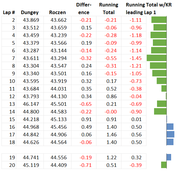 If it had been the other way around, with Dungey getting pinched behind Anderson and Roczen, would the race have ended differently? If you exclude Lap 1, as you can see below, then Roczen would have had the lead after Lap 2 because he was 0.21 seconds faster than Dungey in that lap (the red number under "Difference" in the table below -- Roczen going faster than Dungey are negative numbers in red; Dungey going faster than Roczen are positive numbers in black). Roczen would have held this lead through Lap 9 -- see "Running Total" where the number stays negative (i.e., Roczen is ahead) until Lap 10, when Dungey hypothetically would have caught and passed Roczen. Dungey then extends his hypothetical lead to 1.4 seconds after Lap 16, and holds that lead through the end (the times are less reliable as we get toward the end of the race when Dungey and/or Roczen most likely throttle down a bit since Dungey's lead in the actual race was effectively insurmountable). So that hypothetical is what's shown in "Running Total", where Dungey still takes the lead and pulls away: