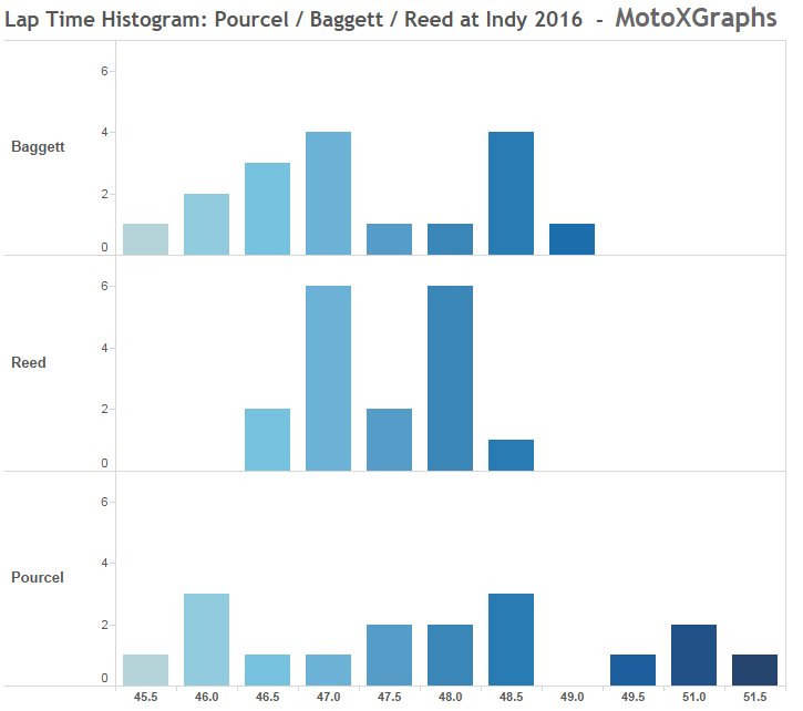 Blake Baggett's distribution seems fairly normal: a few laps in the 46 seconds and under range, which was pretty fast for Indy, and he's got some slower laps, 5 of which were at 48.5 seconds and above. Chad Reed, though has an amazingly consistent set of lap times, all falling within a range of about 2 seconds. Pourcel, on the other hand, has several fast laps, like Baggett, in the 46 seconds range, but he also has 4 laps way to the right on the histogram -- laps that were 49.5 seconds and above. Those were laps 15 through 18 for Pourcel, and he was passed by Baggett on Lap 15 and by Reed on Lap 18. Now the laps before and after that matter, too, but if Pourcel was able to keep it in the 49 seconds or below range during those laps, maybe he holds off Baggett and Reed for an even better finish.