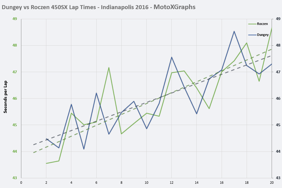 Well, the fastest lap put up by any of the other riders was by Eli Tomac, who logged a 44.836 in his second lap (Trey Canard had the next fastest, at 45.212 in Lap 5, and Jason Anderson was next after that at 45.503). Together, Dungey and Roczen had 7 laps faster than Tomac's fastest! That means the 7 fastest laps out of all the riders in the Main Event were from Dungey (4 of them) and Roczen (3 of them). (Excluding Lap 1 from any of this.)