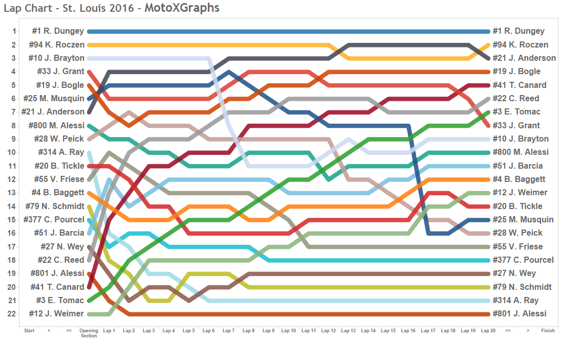 As mentioned above, Justin Brayton was running in 3rd from the start of the race up until Lap 7 when he had his run in with Anderson. He dropped to 11th after the collision, then worked his way back up to 9th. His average lap time in laps 2 through 18, excluding the two laps affected by the collision, was 55.9 seconds -- slower than Canard's (55.5), Reed's (55.8), and Bogle's (55.6), but faster than Tomac's (56.1). So it's not totally clear whether Brayton would have been able to hold on to 3rd over Anderson and these other guys for the remainder of the race.