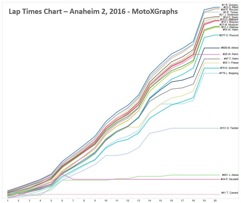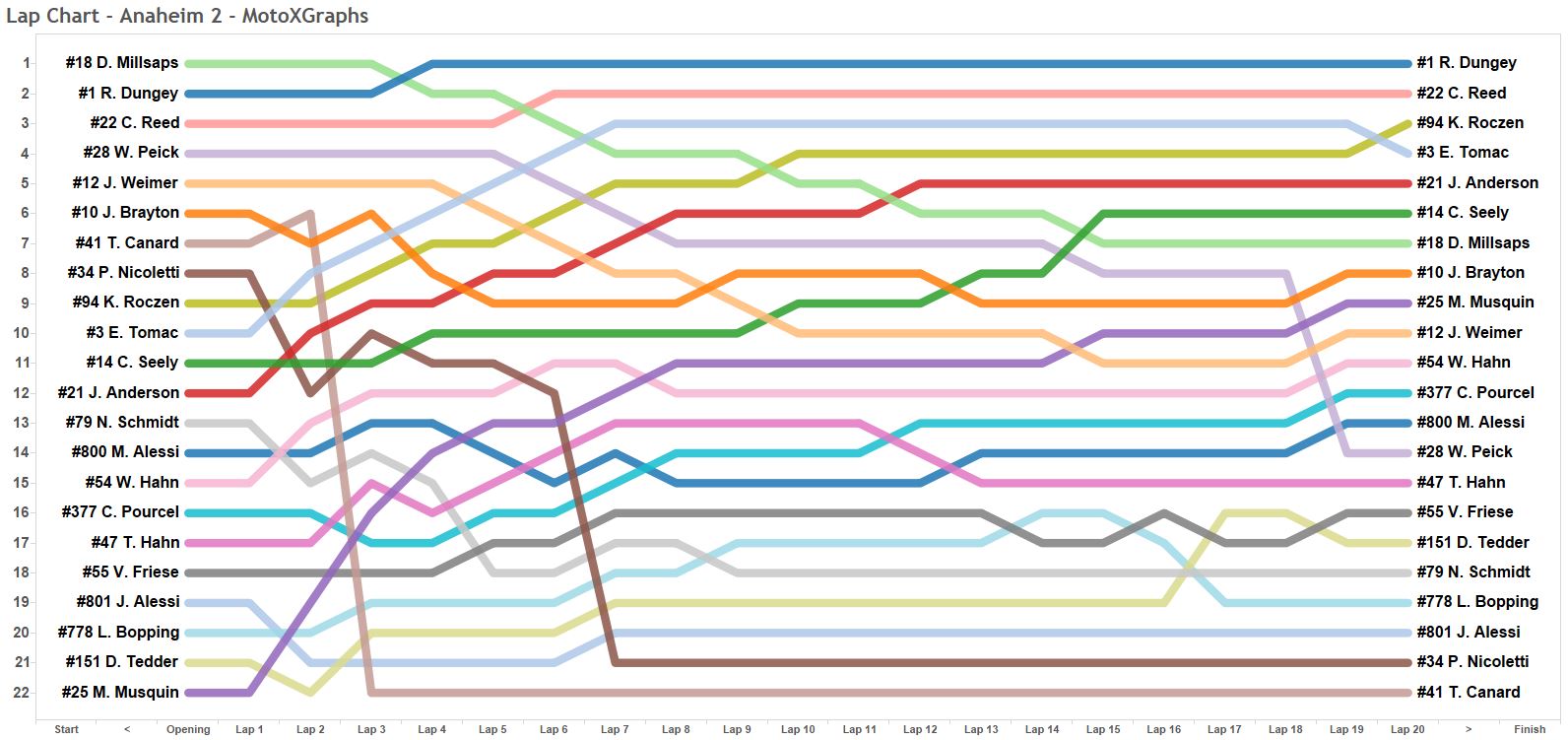 Trey Canard had a rough day, that we won't need numbers to describe.  He registers a DNF after getting tangled up, crashing, and sustaining a second injury for the day at the end of Lap 2.  He was originally projected at #3 in the preseason predictions, just ahead of Tomac, but so far Canard has not seemed like a top contender this year, and the numbers, when updated after this week, likely will match as this as he should drop back toward #7 or worse.
