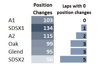 As I was saying, it's pretty clear that something is up with SDSX2 (that's what I'm using as shorthand for San Diego 2, though I apparently may be the only one). It had only 56 position changes, which is less than half of SDSX1 or A2. Perhaps they thought SDSX1 was too easy to pass? Is that even a thing? In the next column, just for fun, I threw in how many laps during the race had ZERO position changes -- every spot was occupied by the same rider for an entire lap. Again, SDSX2 was the stingiest track, with just over a quarter of the laps having no positions changed at the end of the lap compared to the beginning.
