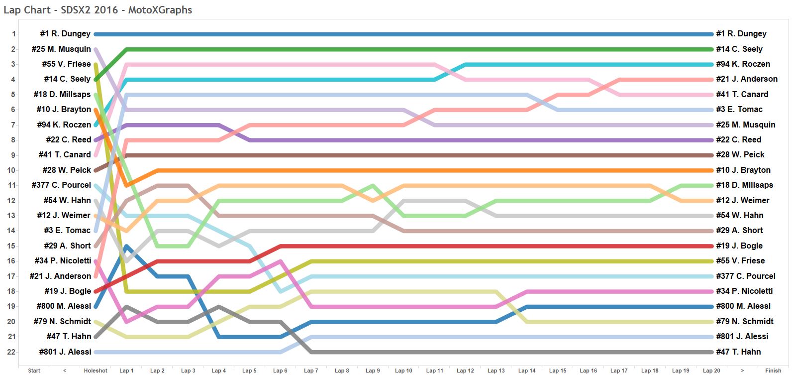 Jason Anderson - he DEFINITELY has the most interesting line on the chart up there. Hole shot at 17th -- he just can't shake that bug for poor starts -- and came out of Lap 1 in 8th, then he made passes on laps 5, 11, 15, and 17 to move all the way up to 4th.