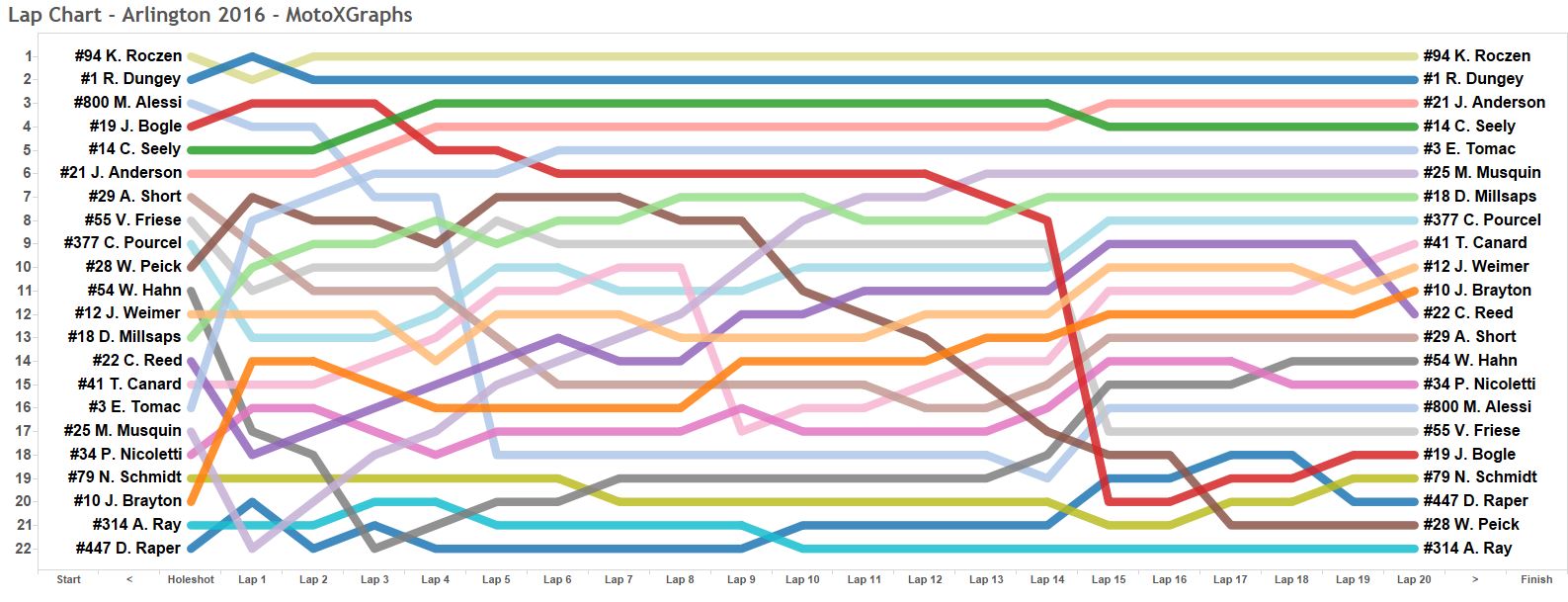 With all of the excitement going on at 1-2, the rest of the race was overshadowed. Some notable results did happen outside of the two stars, though. I would say Jason Anderson had his most consistent night. He qualified with the 8th best lap (not great), then won his heat race. He got a reasonably good holeshot, in 6th, then eventually caught Cole Seely in lap 15, securing a 3rd place finish. I was curious if Anderson, in his late-charging fashion, was closing the gap with Roczen/Dungey of the last half or last third of the race, but that wasn't really the case. In laps 15 and 16, Anderson was faster than the average of Roczen and Dungey, but in all the other laps Anderson was slower.