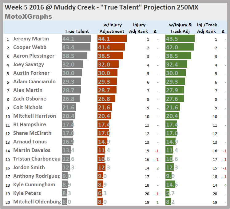 A few major track adjustments are in there -- Weston Peick is expected to do 4 points better at Muddy Creek, and Kyle Chisholm is supposed to do 3 points better, compared to riding elsewhere.