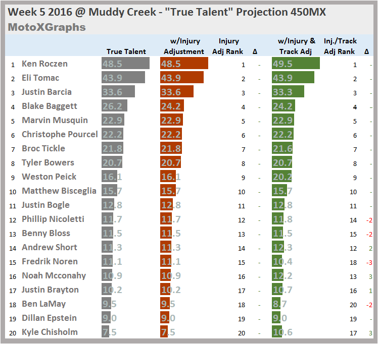 Who's got the talent and primed to win this week at Muddy Creek? The "This-Week" rankings look at the rider's perceived talent (aka "true talent") as well as injuries and the rider's history at the upcoming track.
