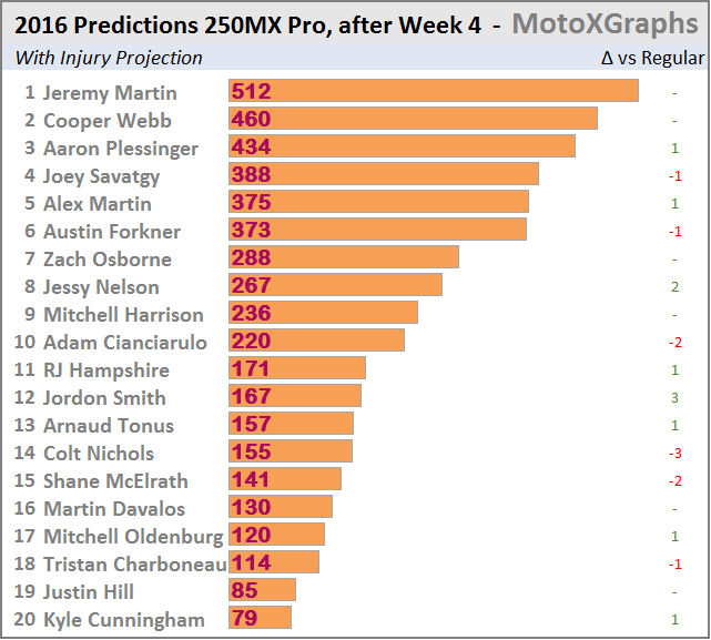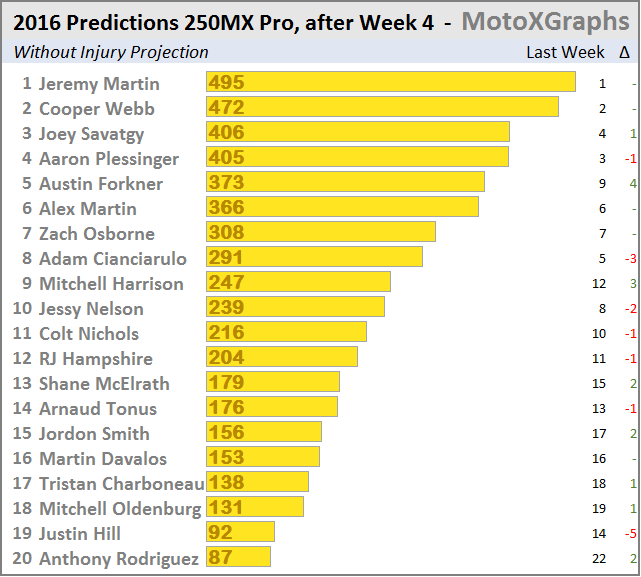 Despite his good racing and large lead in points, the numbers still don't trust Joey Savatgy to finish as #1. Jeremy Martin is still expected to retake the lead, with Cooper Webb taking 2nd. Austin Forkner has moved into 5th, right in front of Alex Martin, whose surprising success has still not moved him up into the Top 5 of the projections. Alex Martin has such a long track record that is much worse than how good he's been to open the season.