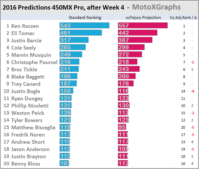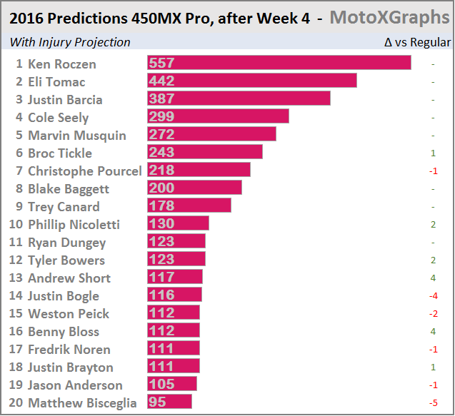 After taking into account riders' injury history, Broc Tickle moves up to 6th overall, which may seem a bit high, but with all the injuries it could be possible. Both projections together: