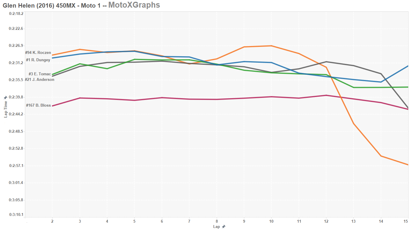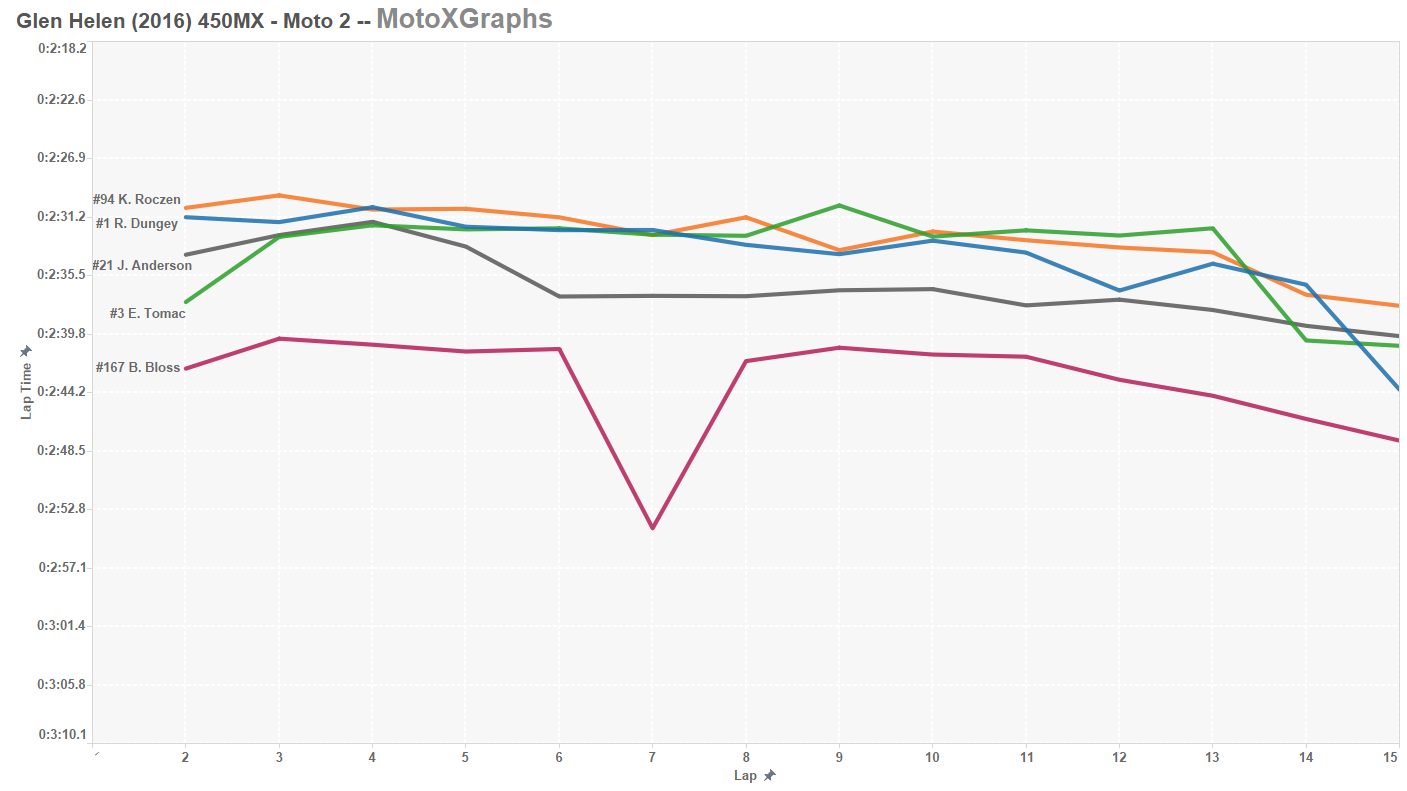 So while Roczen was clearly faster than all competitors in Moto 2, there were some spots where Dungey and Tomac (but not Anderson, for whatever reason) were able to at least match Roczen's speed. Is that because Roczen had enough of a lead he could cruise a little bit? Maybe, but Tomac's fastest lap, (Lap 9, 2:30.4) was faster than all Roczen's, except one (Lap 2, 2:29.6).