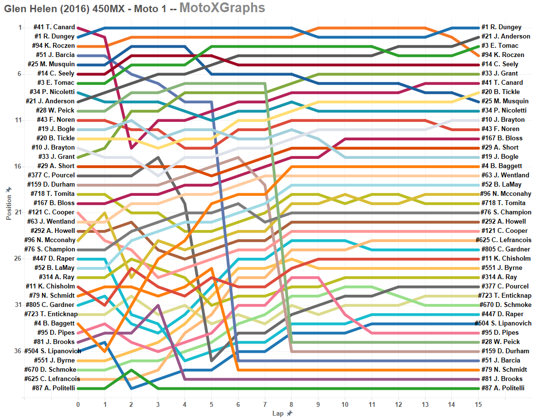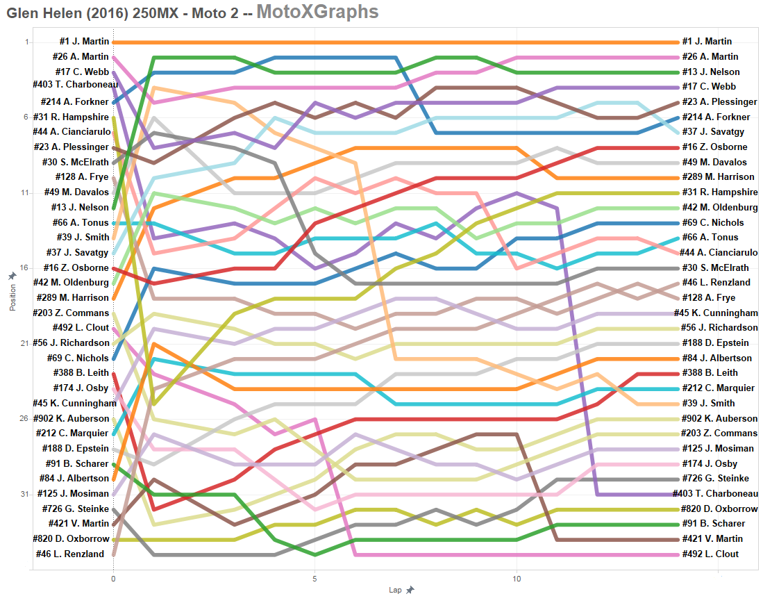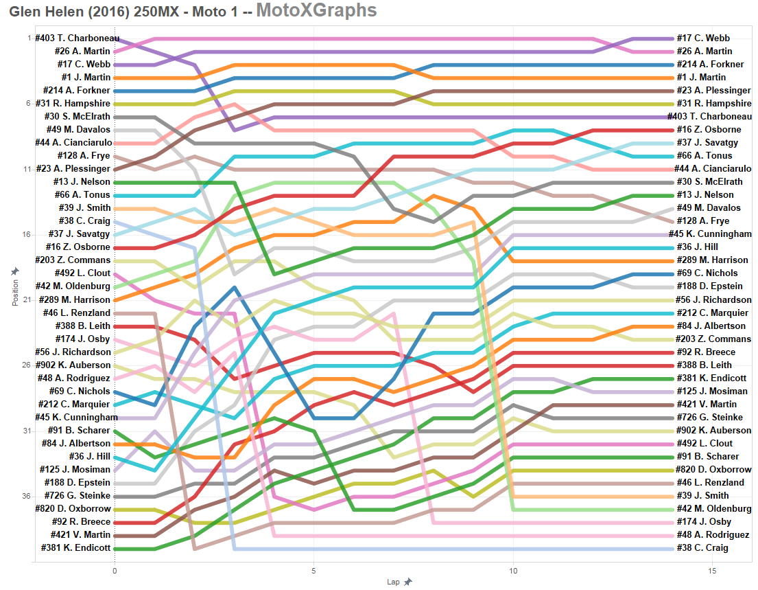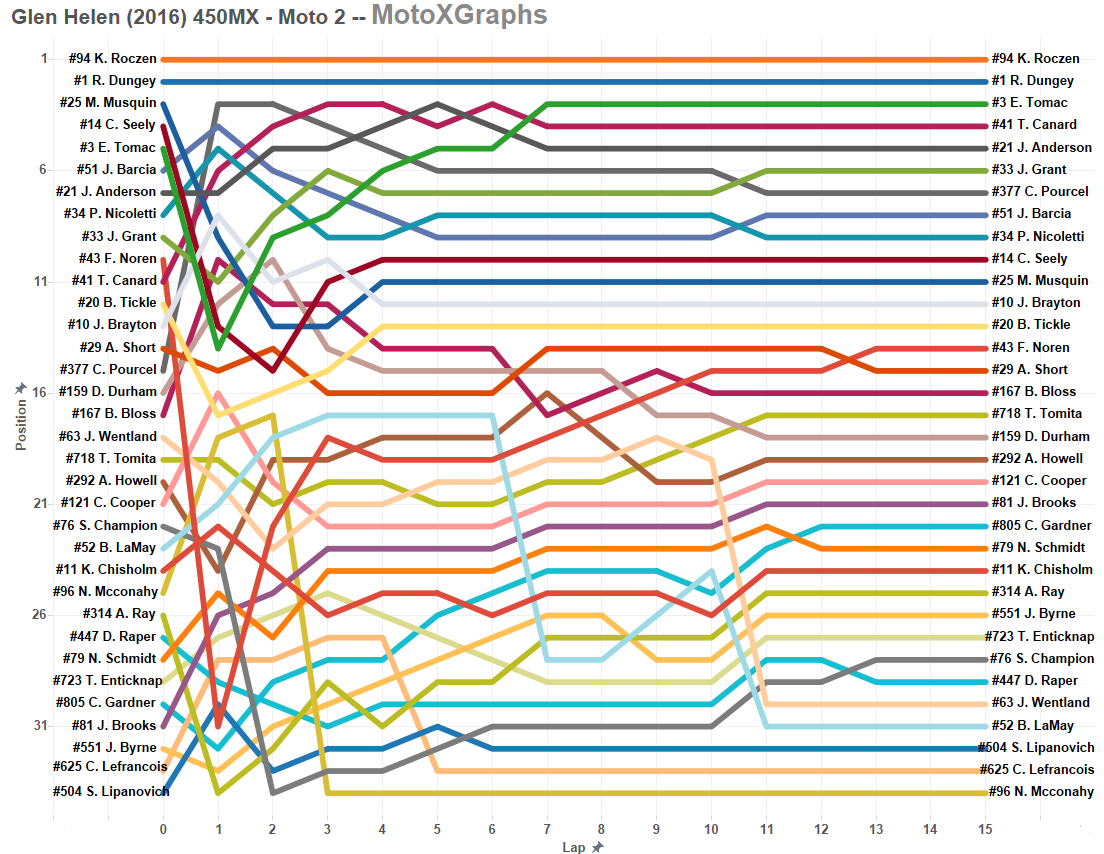 For now, there's only lap charts for the 450's available. 250's to come, along with some analysis of Roczen's roller coaster ride in Moto 1 and then Roczen's dominance in Moto 2. [Edit: 250's now also on the page.]