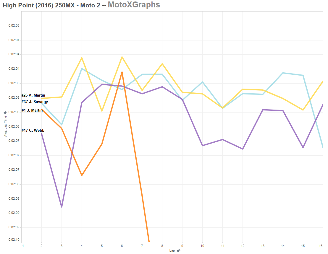 If Jeremy Martin's bike hadn't failed, was he running a faster pace than Savatgy and Alex Martin? Should we expect that he would have held on to 2nd (or 1st, for that matter)? Jeremy Martin started off with a much better Lap 1 than Martin, Savatgy, and Cooper Webb, but as mentioned above the official timing had issues. We can see that Jeremy was already slower than brother Alex and slower than Savatgy in laps 2 through 6. Possibly the bike was already having trouble then: