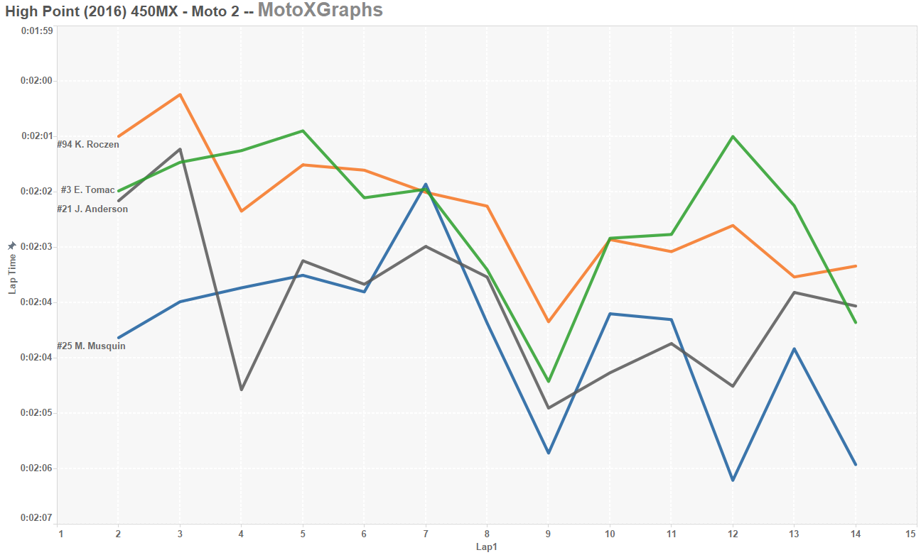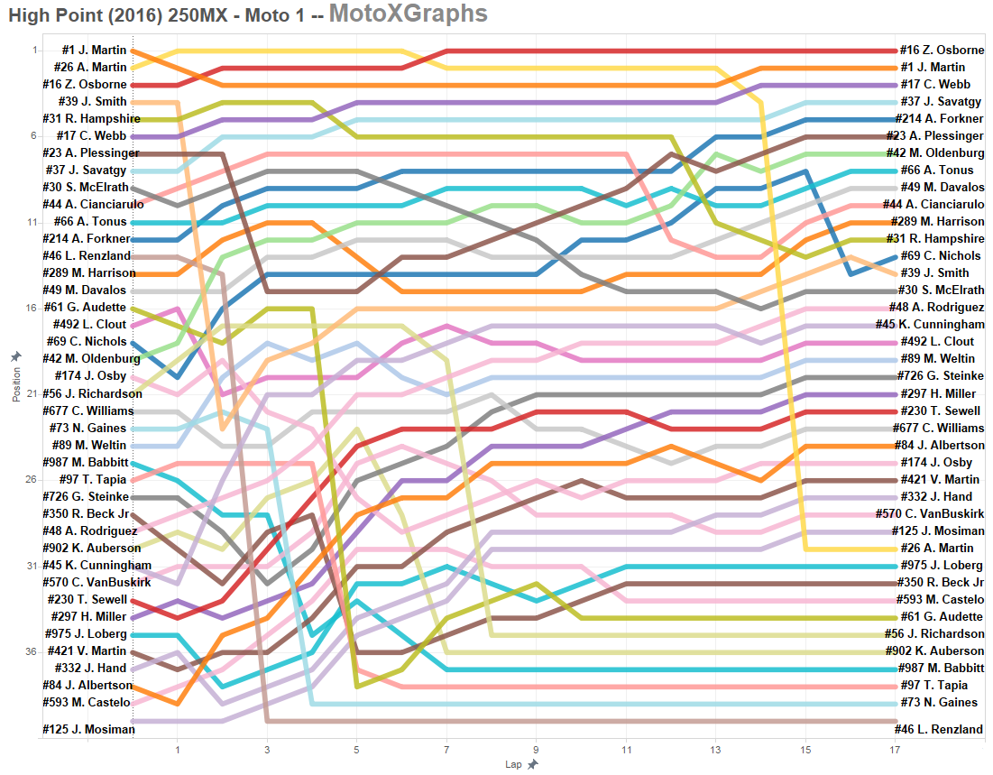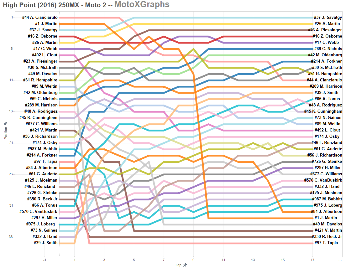 (There was also a timing issue at the start of 250 Moto 2, so some of the Lap 1 times are estimates, which may have affected some of the positioning throughout the chart. I think it's all ok, but if a position or two is off in the middle of the race, my apologies.)