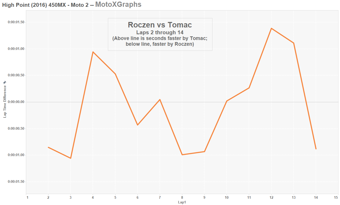 Below, a chart similar to one from last week's recap, comparing Roczen and Tomac to see who was faster in each lap (in laps 2 through 14 where valid data is available). Tomac had his laps (4 & 5), but then Roczen got 3 of 4 during laps 6 through 9. Tomac got 4 in a row after that, but by then Roczen's lead was too large (and Roczen was probably not at his absolute max speed anyway).