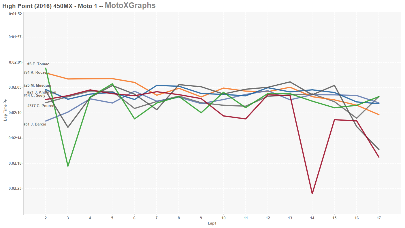Or how about Justin Barcia? Barcia got the hole shot. Barcia managed to run almost the same speed as Roczen through Segment 2. Barcia was then nearly a half-second faster than Roczen through Segment 3. But then reality kicked in, and Roczen made up more than a full second in Segment 4 (1.46 seconds), putting Roczen in the lead before they finished the 1st Lap. Roczen would build a 5+ second lead before Tomac or anyone else could get a crack at him, and no while Roczen didn't extend that lead much, no one ever really challenged him: