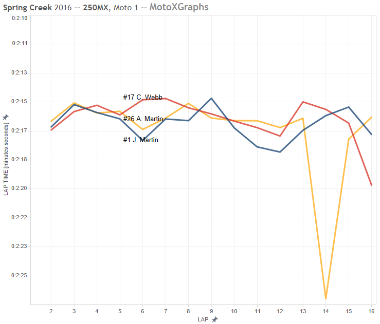 In Moto 1, Cooper Webb passed Martin brother number 1, Justin, in Lap 6, then Martin brother number 2, Alex, in Lap 14. Although AMart held on to first for 13 laps, he wasn't running at a pace noticeably faster than Webb:
