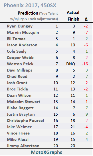 Eli Tomac surprised nearly everyone with his dominant win, but the predictions had him in 3rd, which I'd guess is higher than most would have projected. Of course Marvin Musquin and Jason Anderson were big misses, off by 7 and 6 spots, respectively. Same for Chad Reed, who put in his best race in the past year, finishing 2nd instead of 9th.