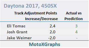 Only 3 were exact, but 8 more were off by 1 or 2 spots. That means 11 out of 19 were within 2 spots, which is decent but not great. Davi Millsaps being predicted exactly in 12th is a good one. Oh, and Eli Tomac at #1, once the Track Adjustment was included (though MotoXGraphs is far from the only place to predict Tomac to win Daytona). Not so good is Broc Tickle predicted 6th but finished 14th. Marvin Musquin was way off, but there were special circumstances with getting held up by Barcia's crash at the opening turn. Mike Alessi had the best day (10th) compared to his prediction (19th).