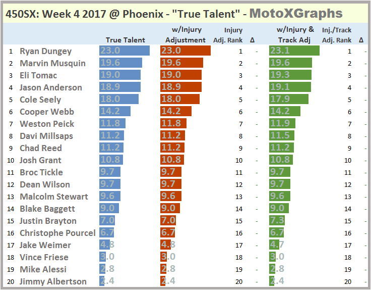 Dungey tops the list for the first time in 2017, and Marvin Musquin makes his first appearance as the leader of the Musquin/Tomac/Anderson/Seely group.  Eli Tomac and Jason Anderson are nearly in a tie for 3rd, with Tomac getting the slight edge -- somewhat coincidentally, those were their finishing positions last year (Tomac 3rd, Anderson 4th).  Tomac's 3rd in Phoenix followed a 7th place the week before in Oakland.