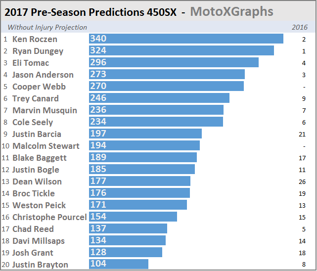 Now, to factor in the riders' injury history for a different perspective on who will finish where.  The injury prediction is always going to be a very rough guide, but it is based off of races missed in both MX and SX for the past 4 years.  Sometimes that is a trend and sometimes it's bad luck (this is discussed at length in The MX Book), so take these with a grain of salt.