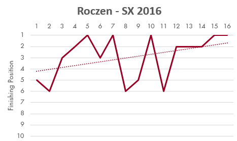 So now instead of just one main factor to consider -- Roczen's improvement -- there are three: Roczen's improvement, Dungey's injury, and Roczen's new bike.  The numbers can't tell much about the latter two, though, so it's up to the viewer to make their own inferences about the effects from those.  But the improvement expected by age is something that we can address.  Starting with Supercross in 2016, while Roczen was not on the same level as Dungey on the season overall, Roczen did show improved results as the season went along: