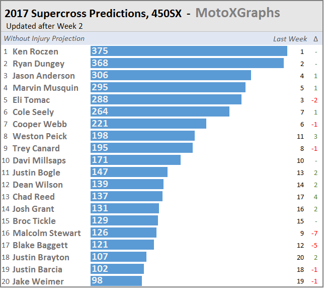 Twice as much data from 2017 compared to last week's update, what's changed in the predictions?  At the top, most notably the gap between Ken Roczen and Ryan Dungey shrinks slightly, while Eli Tomac loses a couple spots, somewhat predictably.