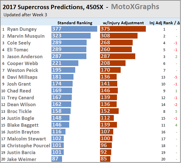 As before, with the field so crowded around the bottom of the Top 10 and the low teens, several riders lose or gain multiple spots. This early in the season, it's very much a toss-up when were' talking about a difference of only 16 (!) points separating 8th from 14th after the injury adjustment. Davi Millsaps still has the biggest predicted drop, expected to lose 5 spots--partly based on projections stemming from recent injury history and partly because he happens to have a pretty slim lead on the riders projected behind him before taking into account the Injury Adjustment.