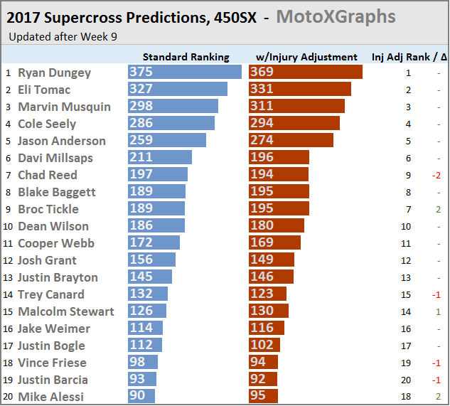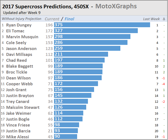 Just like for last week, with fairly minimal movement in the Supercross standing predictions from week to week, the updates for the full-season predictions will be mostly charts, not many words...