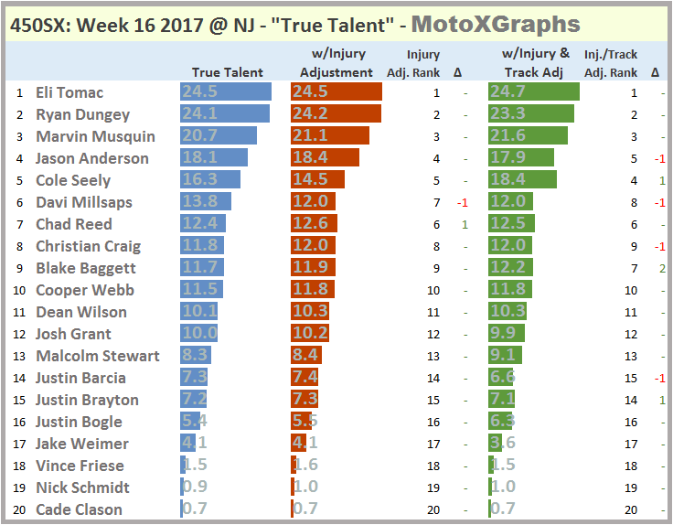 Cole Seely also has a large positive Track Adjustment, moving him into 4th over Jason Anderson -- despite Seely's just returning from a few weeks off due to injury. Seely finished 3rd at MetLife in 2015 and 2016, which was tied for his second-best result of 2016. In 2016, Anderson finished 6th in East Rutherford, which was his fourth-worst finish; in 2015 he finished 9th, which was almost exactly average for him.