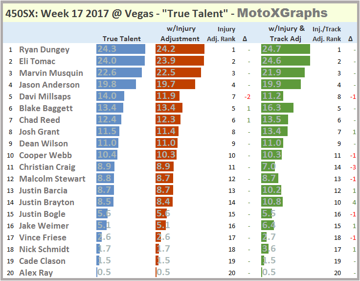 As usual, the updated 2017 Supercross Prediction puts the whole season in perspective, while the "This Week" rankings look at the riders' perceived ability (aka "true talent") as well as taking into account injuries and the riders' history at the upcoming track.
