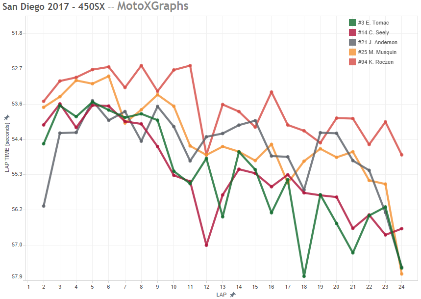 Seely and Tomac can't say the same, though they rode good races -- see below, where their lines are definitely a step below Musquin's. With Musquin's success in both weeks so far in 2017 Supercross, I hope the numbers adjust to reflect what looks like real progress -- he's had some fluky results in the past, coupled with injuries, that have held his results back (at the same time, the numbers for him are a tad low for a reason -- they're hedging their bets, so to speak, because fluky results in the past often indicate fluky results in the future (such as nearly looping out of the San Diego Main Event for no apparent reason)).