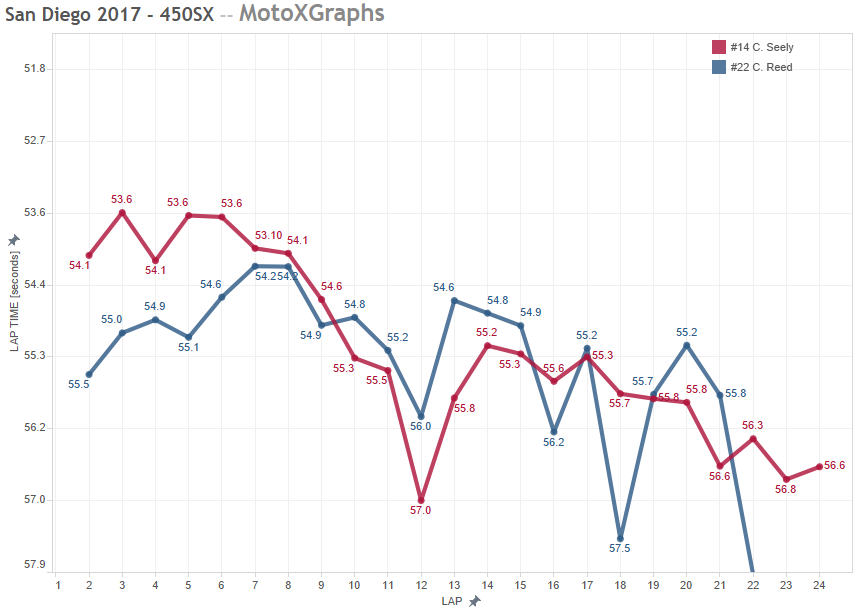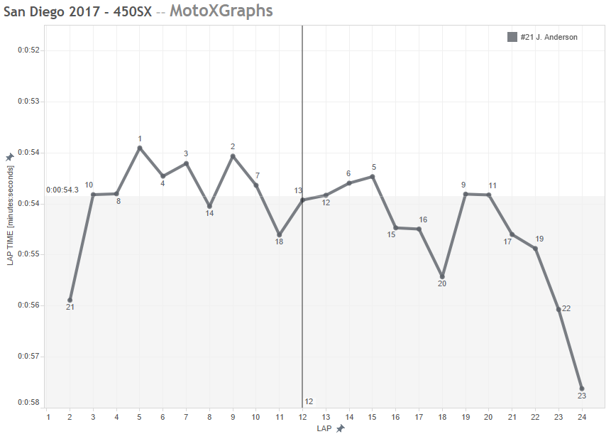 Like Anderson, Webb was also known to be a guy who carried his speed late into the race as a 250 rider, which he appears to in the graph above. Part of that may be getting used to riding the 450 in race conditions, but he put up his 4th, 5th, and 7th fastest laptimes in laps 17, 18, and 22, respectively. He would appear to have quite a bit more adjusting to do before he can become a true Top 10 guy (much less Top 5).