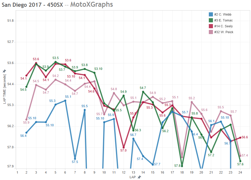 As for Peick, he had the slow-start-and-or-caught-in-traffic bug that Reed had, but once he hit Lap 11 he compared pretty favorably to Tomac and Seely. He was predicted in 10th, so maybe that result is not so surprising. I also tossed Webb's laptimes in the chart, and you can really see the sporadic nature of his race tonight at Petco: