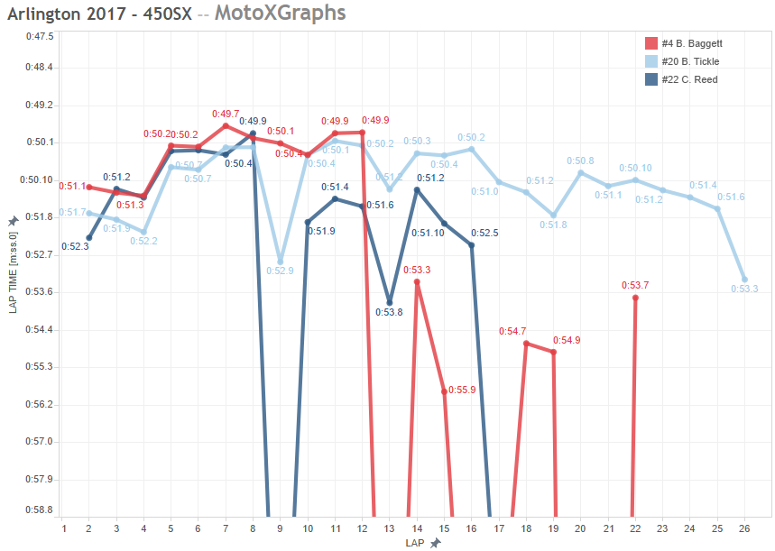 Blake Baggett was having a pretty good night (qualified 4th and was 3rd in his Heat Race) up until Lap 12. His pace was better than, say, Broc Tickle (finished 6th), but the crash dropped Baggett from 6th to 15th over the next few laps. Chad Reed suffered a similar fate, dropping from 9th to 15th in Lap 9, then pulled into the pit with a flat tire, dropping from 10th to 19th (a DNF) in Lap 19: