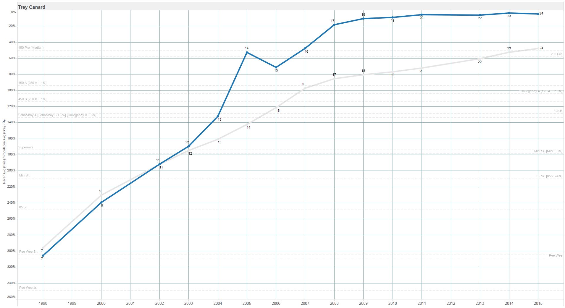 One is that (sorry, Canard is a different color (yellow) in this one) Canard now looks a little worse than the group, going through age 18. Dungey has a weird progression, not really coming on until his age-18 season. But Canard is clearly below Villopoto and Stewart, which is nothing to be ashamed of. The other thing is that the four of them really overlap in ages 19, 20, and 21, which I think is a good sign for Canard, in terms of trying to project his future from age 21-onward.