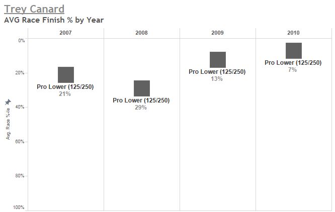 His average finish position dropped from 8.5 to 11.6 and his average finish % dropped from 21% to 29%. (As we now know and as you can see in the above chart, he would rebound in 2009 and 2010 for his MX Lites results.) In 2009, Canard went on to the 250SX West season, but he couldn’t repeat his success from 2008, finishing 6th and able to record only one 1st-place finish for the season. If we’re looking at his track record so far and trying to judge his ceiling, we can compare Canard to the riders he finished behind in that 2009 250SX season: Jake Weimer, Ryan Morais, Justin Brayton, and Chris Blose (I’m excluding Ryan Dungey).