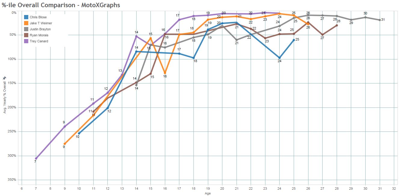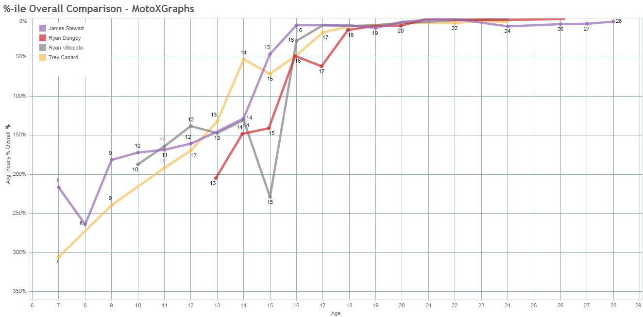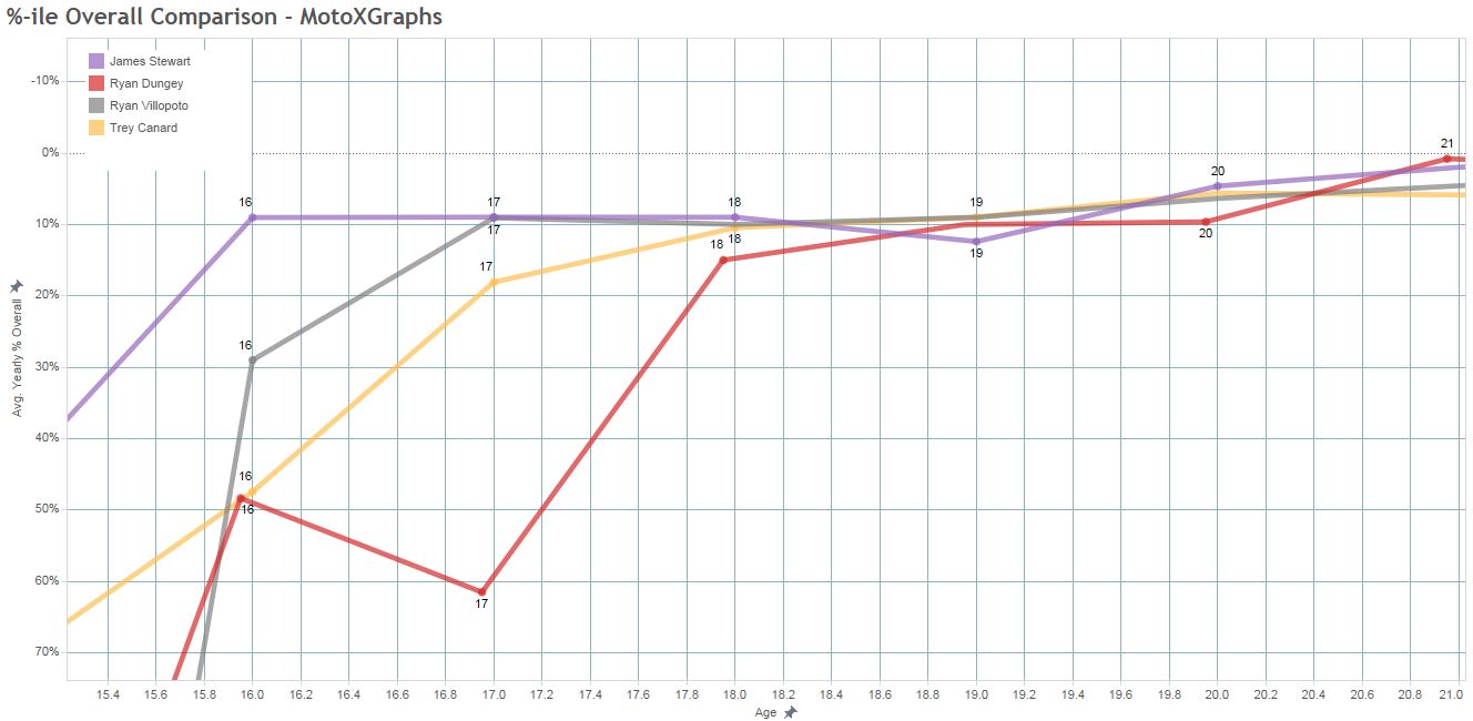 If we zoom in, we can see that Canard is neck-and-neck with Villopoto at 18, 19, and 20, but he starts to fall behind all three after that – we'll get to why. So at this point, if we only knew what these 4 riders had done through their age-20 seasons, I think I would say that James Stewart had the best profile, with Canard and Villopoto right behind, and Dungey bringing up the rear.