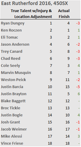 Eli Tomac was expected to do much better than normal (approx. 2.7 spots), and he finished 2 spots better than his prediction without the location adjustment. Weston Peick was predicted to finish about 1.3 spots better than his prediction without the location adjustment, and he finished 3 spots better. Even though the Location Adjustment is still in experimental phase, this week's results were two for two, which is a good sign that the adjustment may prove to be predictive.