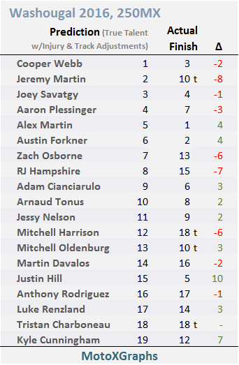 The major miss in the 450's was Andrew Short, who finished tied for 5th (6th after the tiebreaker) with a 6 / 7 -- his two best race results of the season. Why is he predicted so low, all the way down at #15? Part of it is the age adjustment, which penalizes him but perhaps has too strong an effect now that we have so many races from the current season to inform us about his expected performance. But even without that adjustment, he'd be predicted around 10th or 11th -- his 2015 MX results (5 races) averaged 14th overall. And in 2016 his average result has been 12th. So I don't think there's any way to have seen that 6 / 7 coming from Short at Washougal.