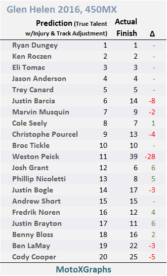 Glen Helen? A few big surprises, but overall the predictions did well again, getting the top 5 correct for the 450's (with a little help from Roczen's air