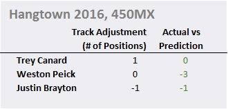 The 250 class didn't have any Track Adjustments of note for Hangtown 250 riders. Jessy Nelson had a small downward adjustment, that didn't result in a change of spots for his prediction. He did finish one spot worse (6th) than his prediction before the Track Adjustment (5th). Matt Bisceglia had a large Track Adjustment, but he didn't end up riding and I haven't heard why.
