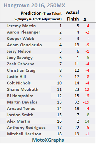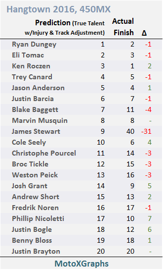 Marvin Musquin, despite having no prior history in the 450 MX class and therefore only 250 data, was predicted 8th and finished 8th. Probably more lucky than good, but that's an encouraging sign for the translation used to compare 250 results with 450 results.