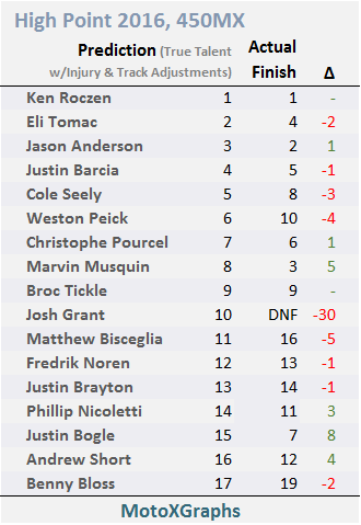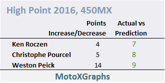 Roczen was expected to earn 4 more points at High Point than his prediction before the track adjustment, and he earned 7 more than predicted (earned 50 vs prediction of 43).  Pourcel was expected to earn 5 more points than his prediction before the track adjustment, and he earned 8 more than predicted (earned 23 vs prediction of 15).  Peick was expected to earn 14 more points than his prediction before the track adjustment, and he earned 9 more than predicted (earned 21 vs prediction of 12).  So, all three adjustments pointed in the right direction, which is a good sign for the location adjustment.