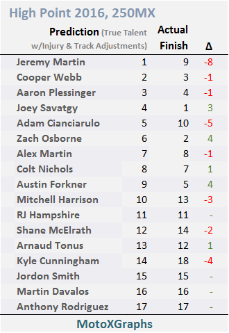 The 250 class had one notable Track Adjustment, for Kyle Cunningham -- he was expected to finish 6 points better at High Point than his regular prediction.  Instead, he finished right in line with his prediction before the Location Adjustment (earned 9 vs 8 predicted).  In the right direction, I guess.