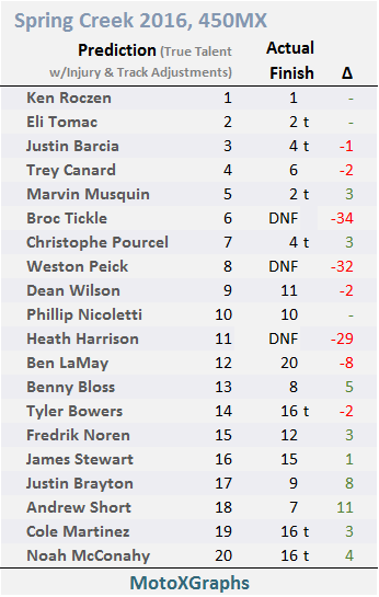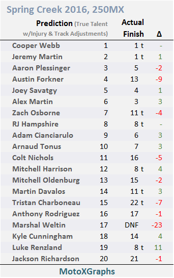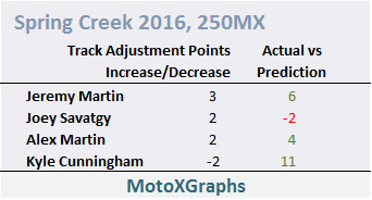 The 450's had notable Track Adjustments for Trey Canard and Heath Harrison -- each were supposed to earn 4 more points than their non-adjusted prediction. Canard was returning from injury, and he earned 4 fewer points that expected. Not sure we can read much into that. Harrison had the DNF mentioned above, which certainly doesn't match the predicted adjustment.