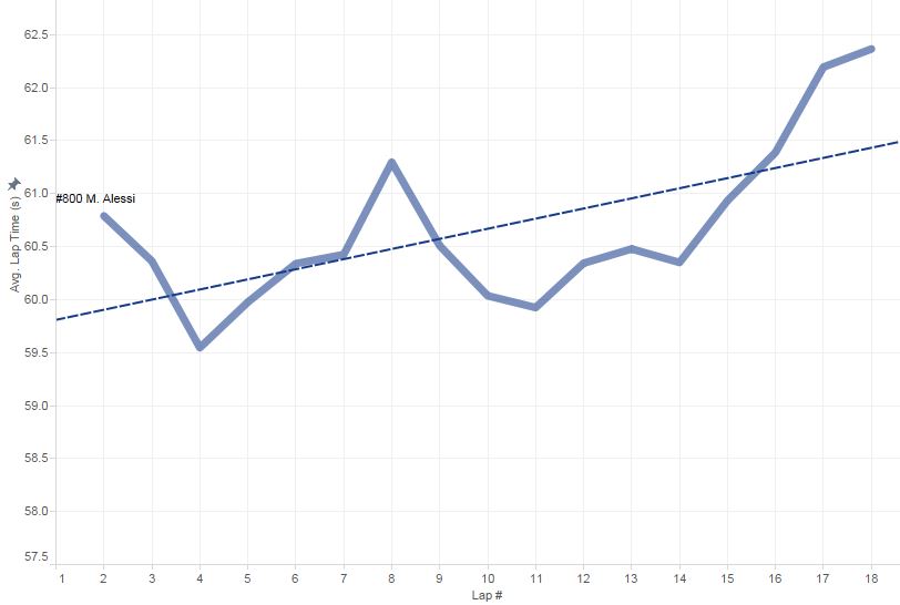 The last rider suggested, Mike Alessi, differs from the others in that he's typically riding in the bottom-half of the pack, rather than the top-half as we would expect from the others. That might change how we view the WHY of the increase lap times, but his average is substantially higher than the others we've looked at: 0.096 seconds increase per lap on average.