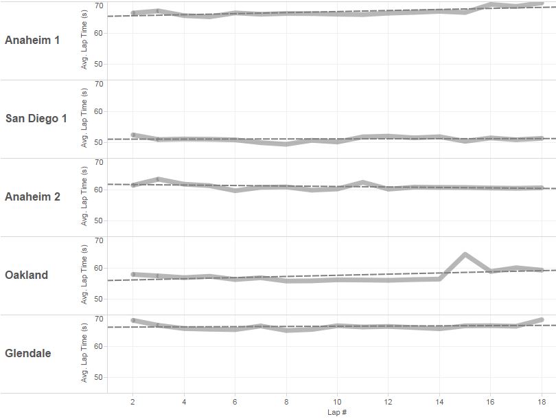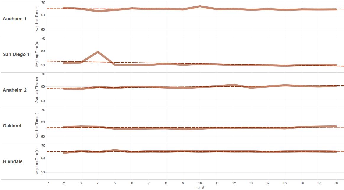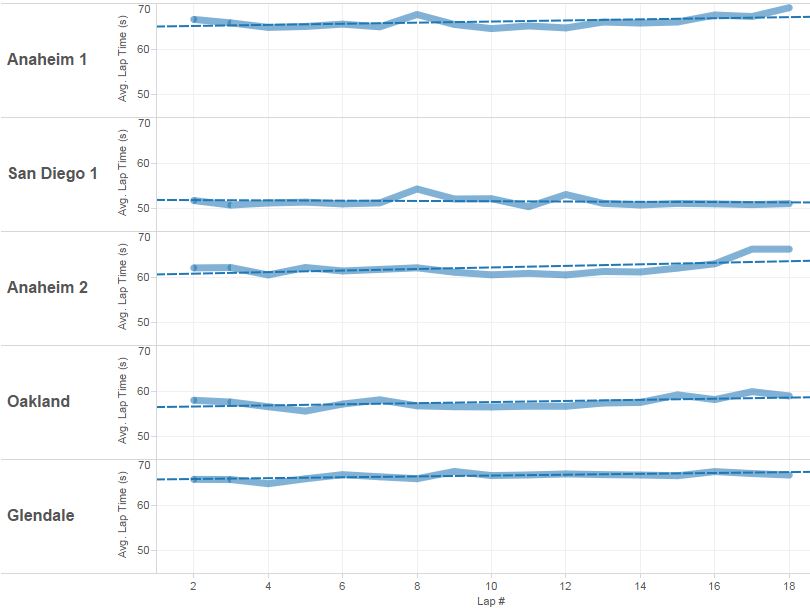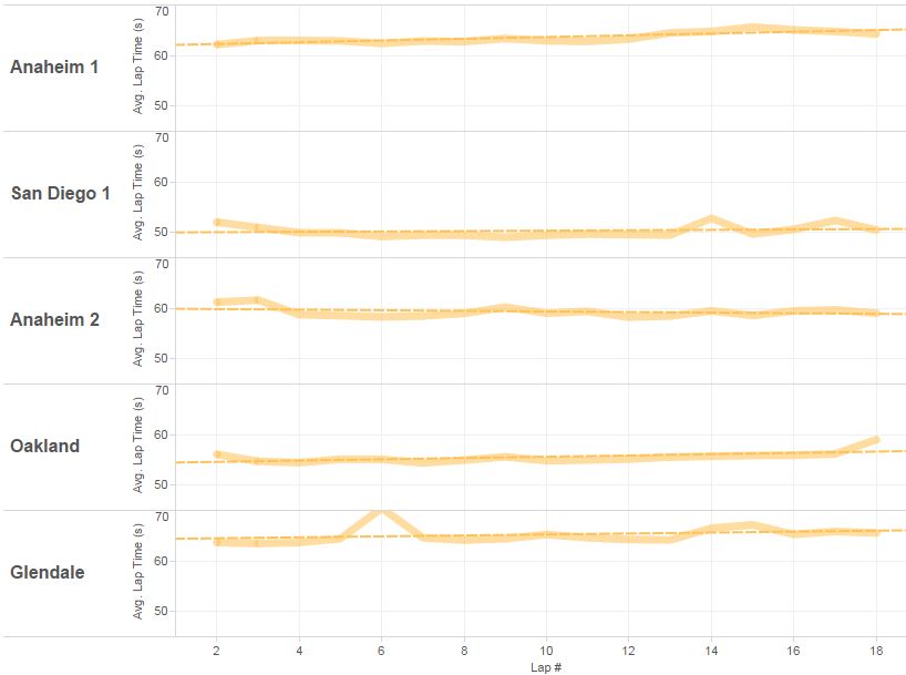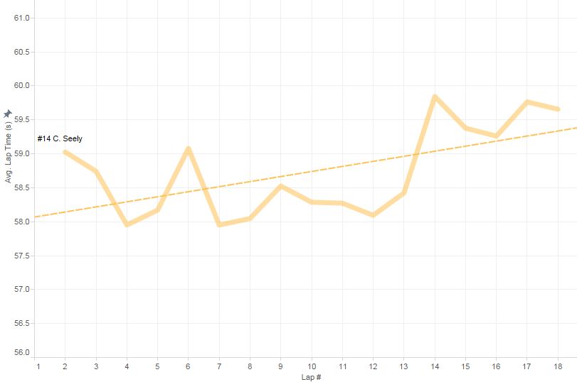 Seely has had quite a bit of fluctuation from lap to lap over these first 5 races. Maybe that's just noise from not enough data, and it will flatten out as the season goes along. His average increase in lap time is 0.074 seconds, which is the highest individual average we've seen so far, though not by a particularly large amount.