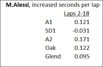 As you can see, Alessi had a "decrease" in seconds per lap in SD1, which looks attributable to a problem of some sort on Lap 8. If decided that SD1 was not indicative of how he normally rides, the average increase without that race would be 0.127 seconds per lap.
