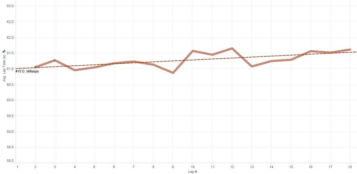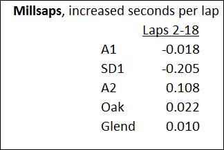 Looks like maybe something was up with A1, as well, for Millsaps. While I don't really love the idea of just removing data if it looks odd, if we did remove it, it only increases his average increase per lap to 0.047 seconds -- still not particularly high. Here I think we're seeing the problem with only using 5 races as the data set, but that's on me ;)
